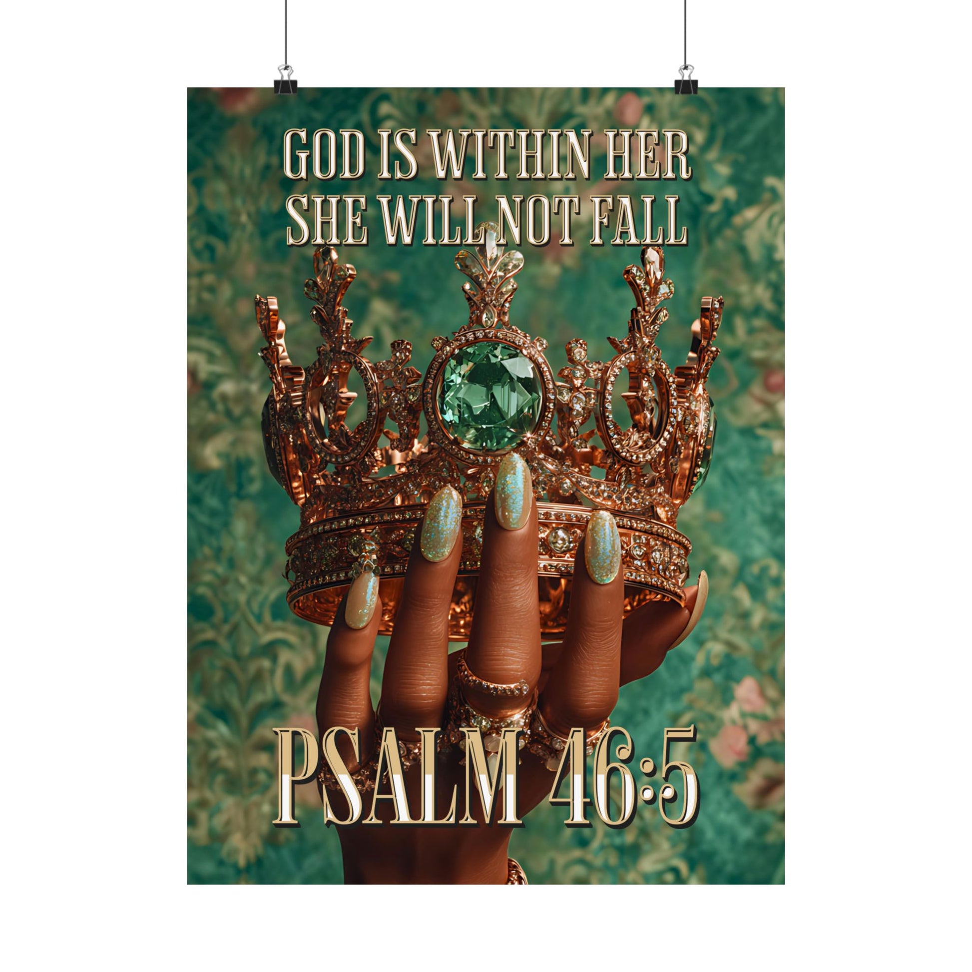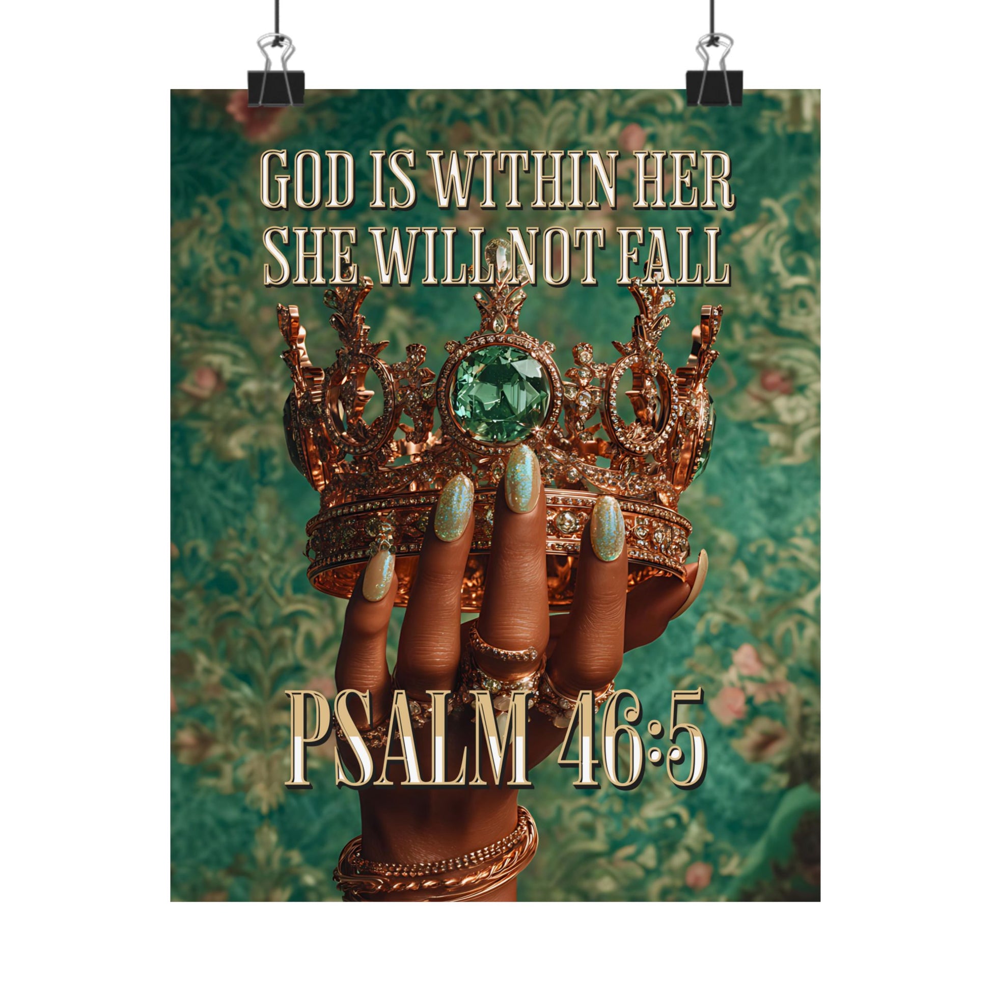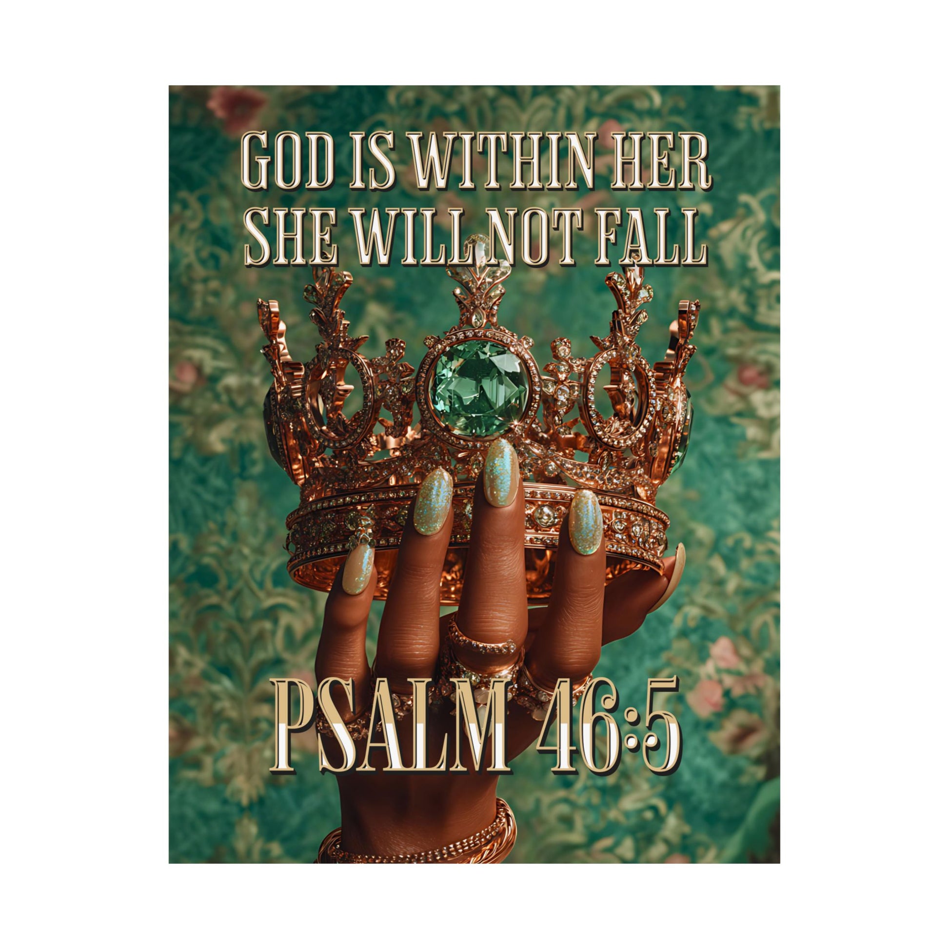 This matte vertical poster merges faith and fierce elegance. A richly textured emerald background frames a crowned, jewel-adorned hand—polished nails and stacked rings catching the eye—while the text “GOD IS WITHIN HER SHE WILL NOT FALL” and “PSALM 46:5” anchors the piece with quiet, confident devotion. Printed with giclée precision on museum-grade archival paper, colors stay vibrant and details remain crisp, making it a meaningful focal point in a living room, prayer corner, or boutique studio. The matte finish softens glare and gives the image a tactile, gallery-style presence that invites reflection every time you pass by.