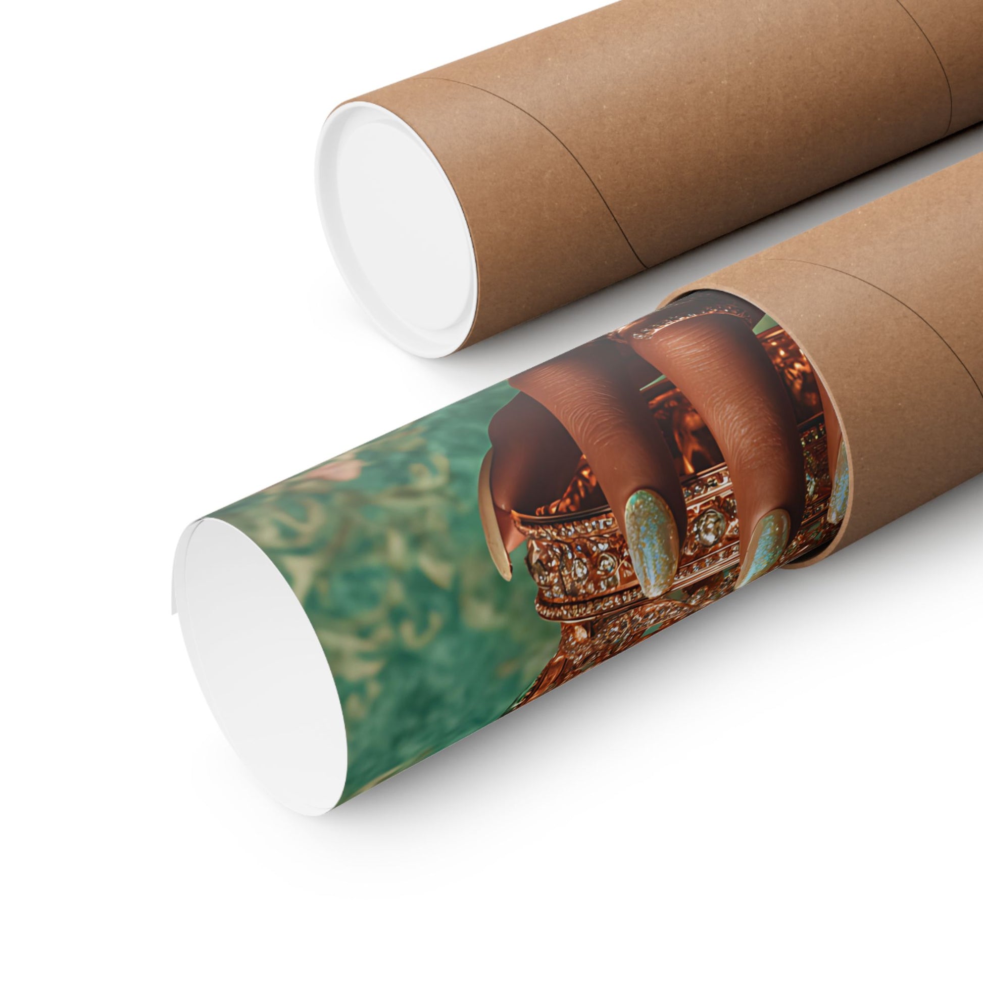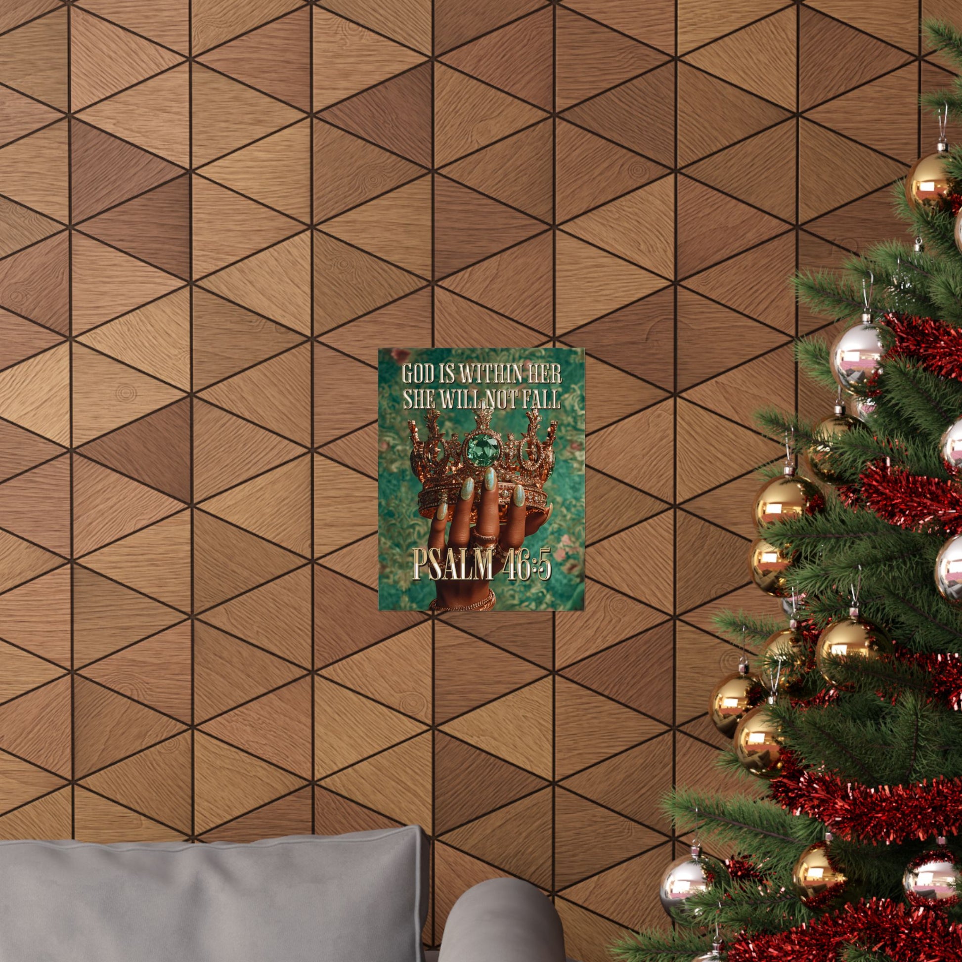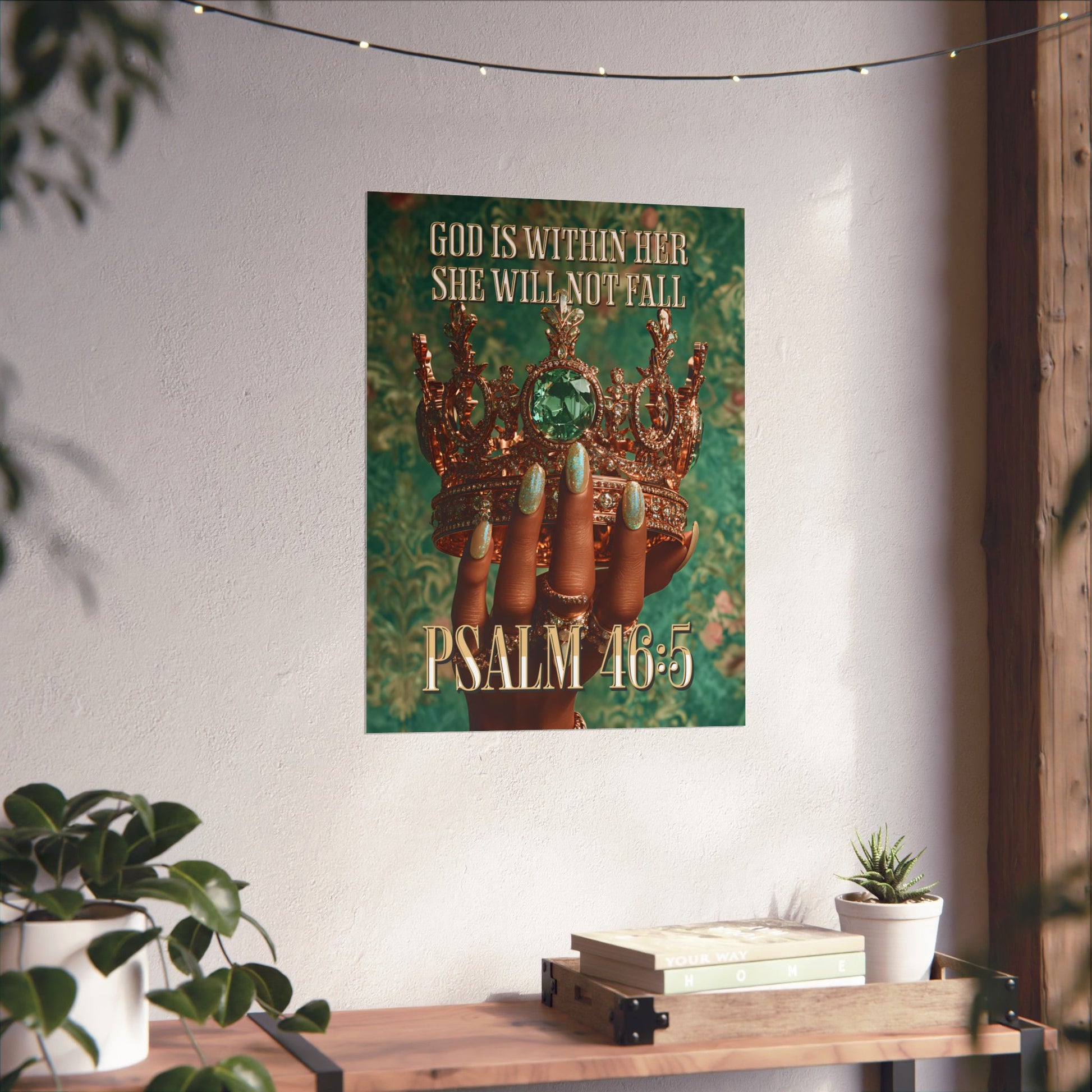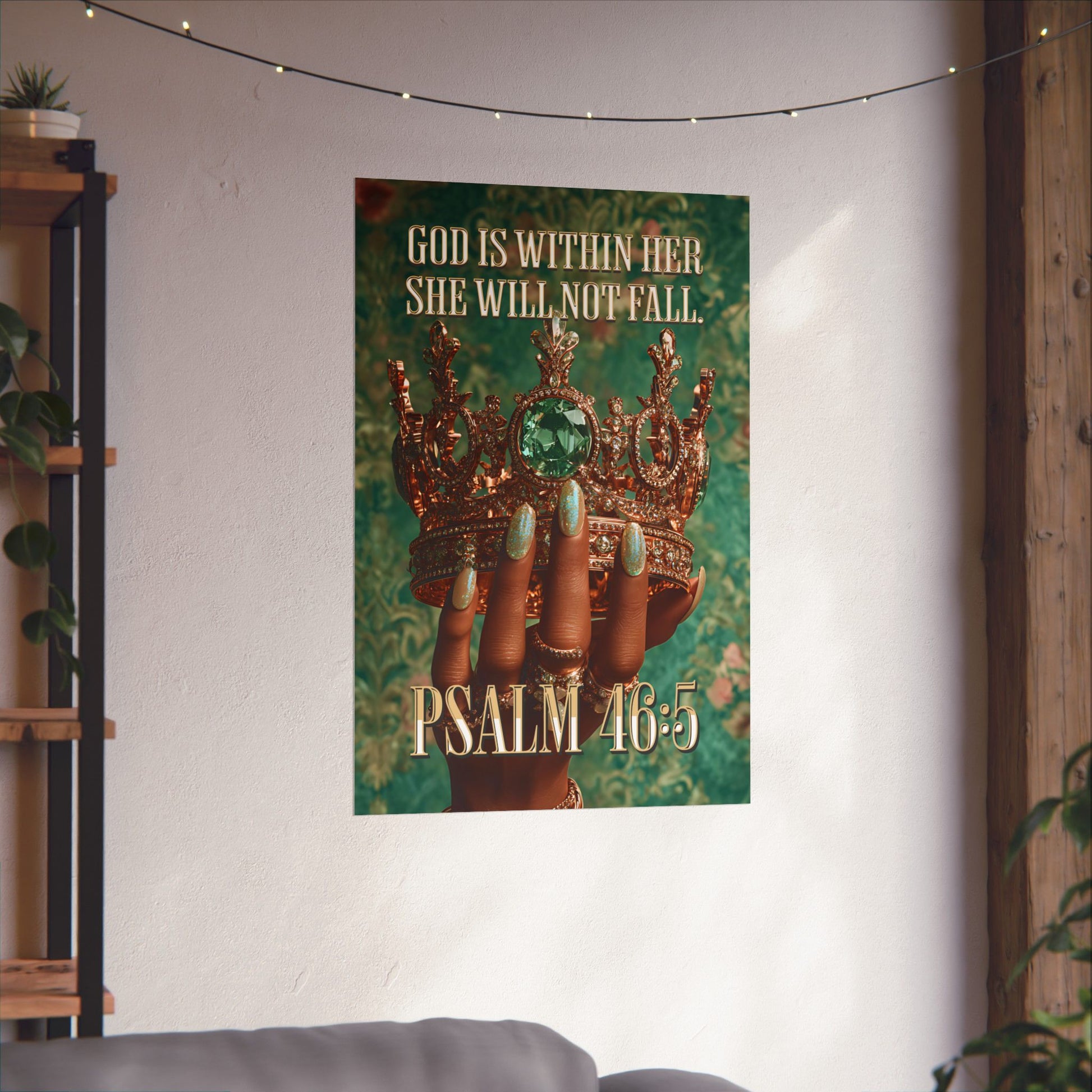 This matte vertical poster merges faith and fierce elegance. A richly textured emerald background frames a crowned, jewel-adorned hand—polished nails and stacked rings catching the eye—while the text “GOD IS WITHIN HER SHE WILL NOT FALL” and “PSALM 46:5” anchors the piece with quiet, confident devotion. Printed with giclée precision on museum-grade archival paper, colors stay vibrant and details remain crisp, making it a meaningful focal point in a living room, prayer corner, or boutique studio. The matte finish softens glare and gives the image a tactile, gallery-style presence that invites reflection every time you pass by.
