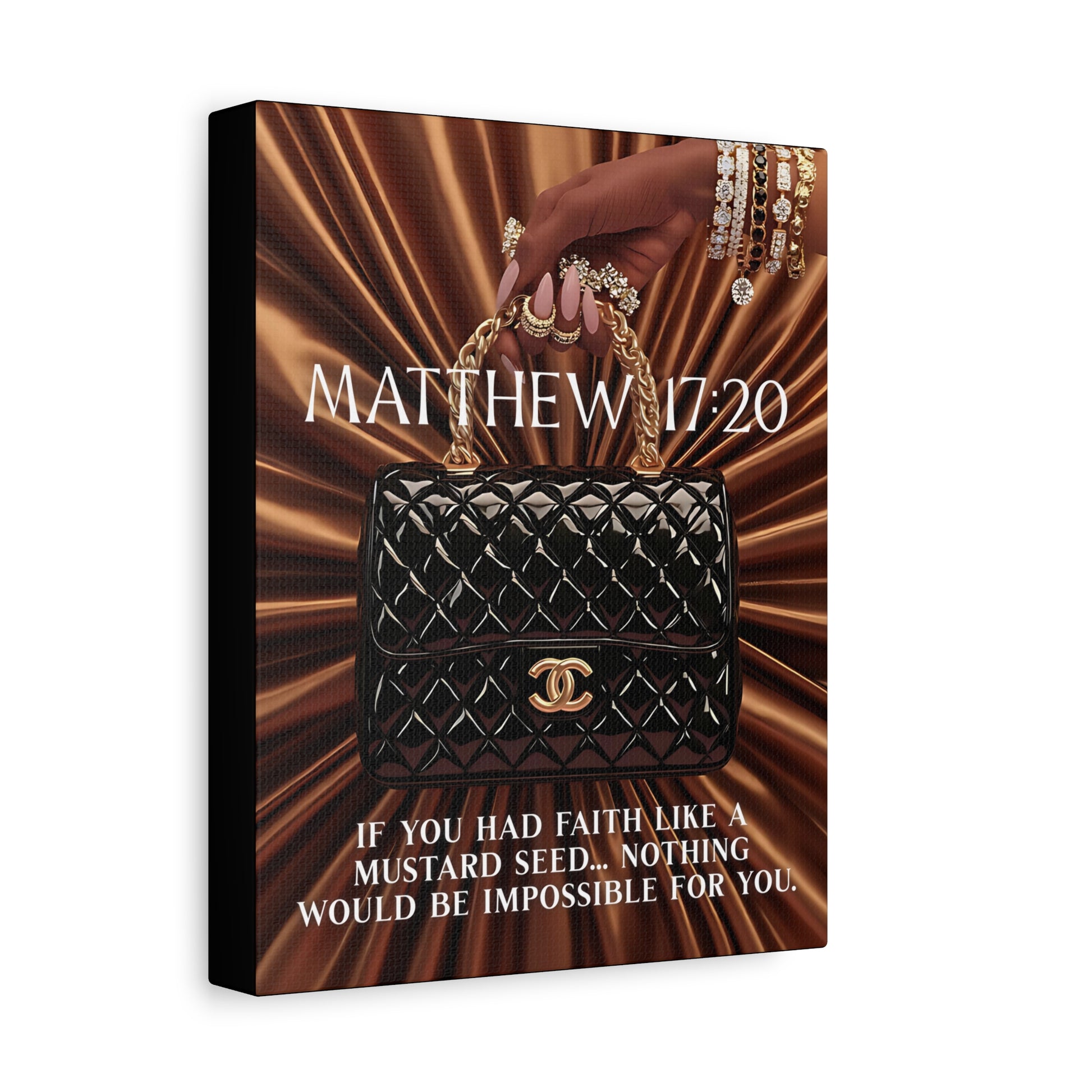 This stretched matte canvas brings a quietly luxurious message into any room. A glossy black quilted handbag and jeweled hand rest against a rich, bronze satin backdrop while the scripture from Matthew 17:20 anchors the composition: a calm, faith-forward reminder rendered with photographic clarity. The soft matte finish reduces glare and emphasizes depth. Stretched over a slim 1.25" pine frame, the piece hangs flush and stable—two small rubber dots protect surfaces and keep it level. It reads like a personal affirmation for someone who values style, faith, and intentional décor.