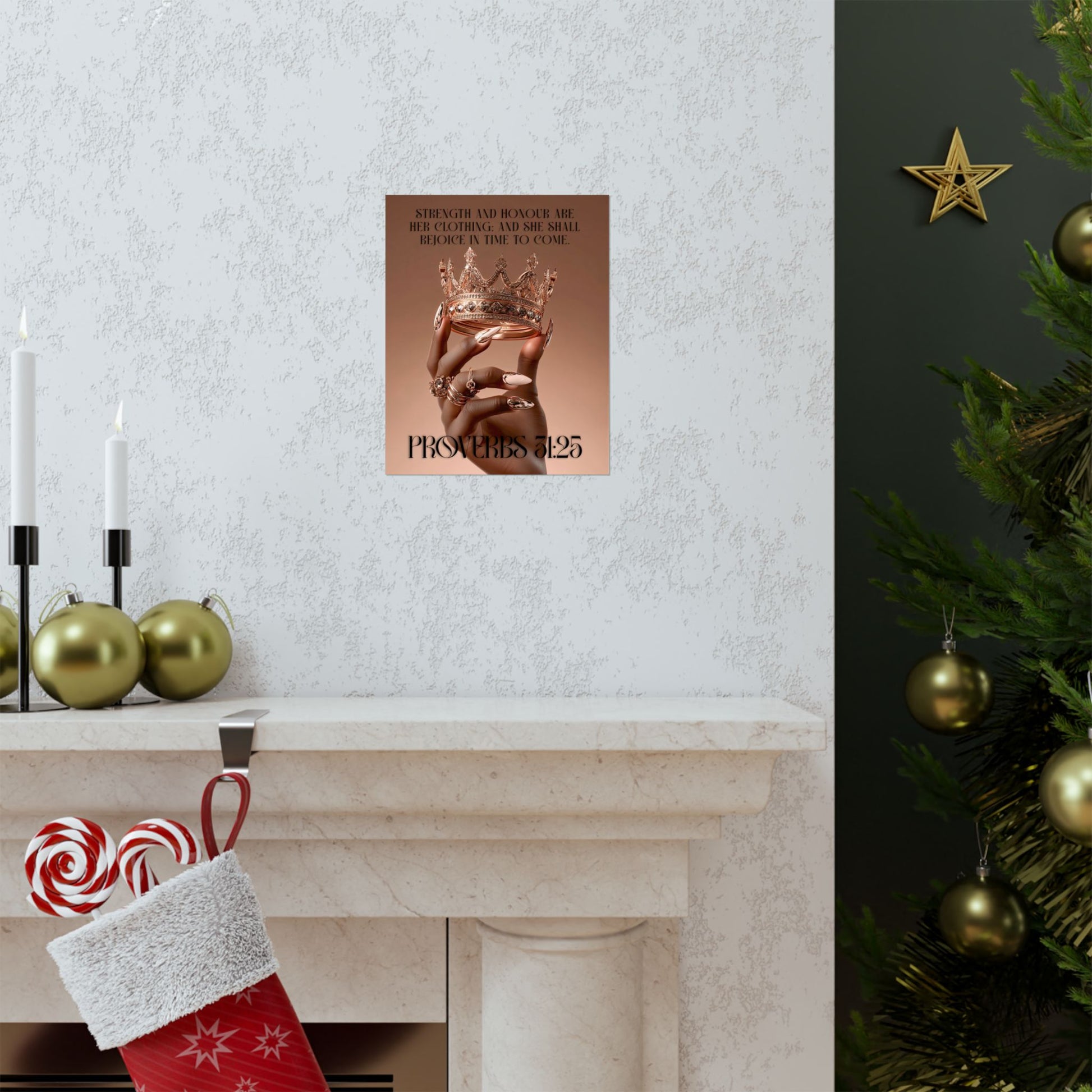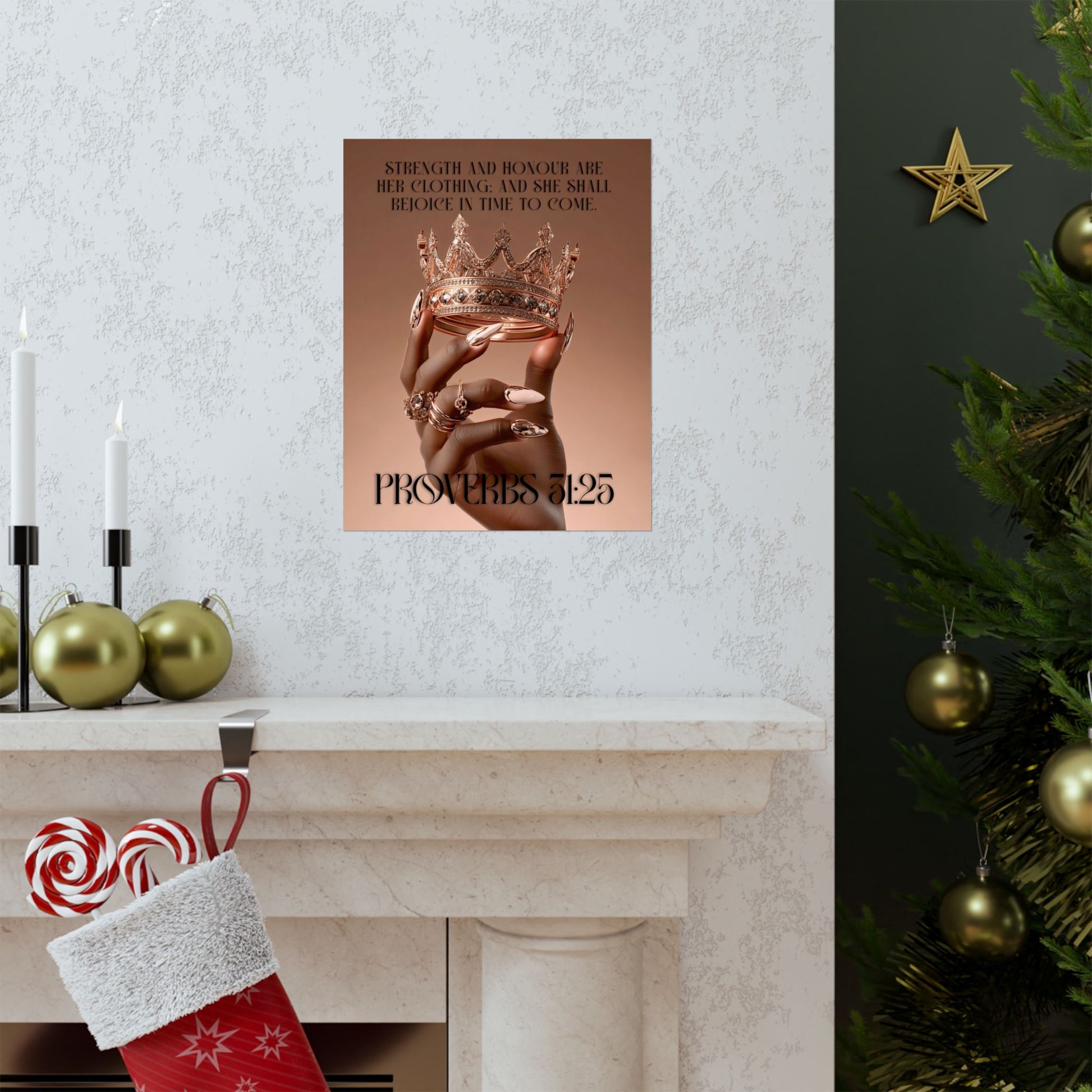 A striking matte poster that celebrates quiet strength and regal grace. This archival museum-grade print captures a richly detailed hand lifting a jeweled crown against a warm, skin-toned backdrop, with the words from Proverbs 31:25 rendered in elegant, modern type. The matte finish softens glare and deepens tones, giving the piece a refined, gallery-style presence on any indoor wall. It reads like a personal affirmation — a daily reminder of dignity, courage, and worth — and slips seamlessly into bedrooms, living rooms, home offices, or faith-centered spaces.